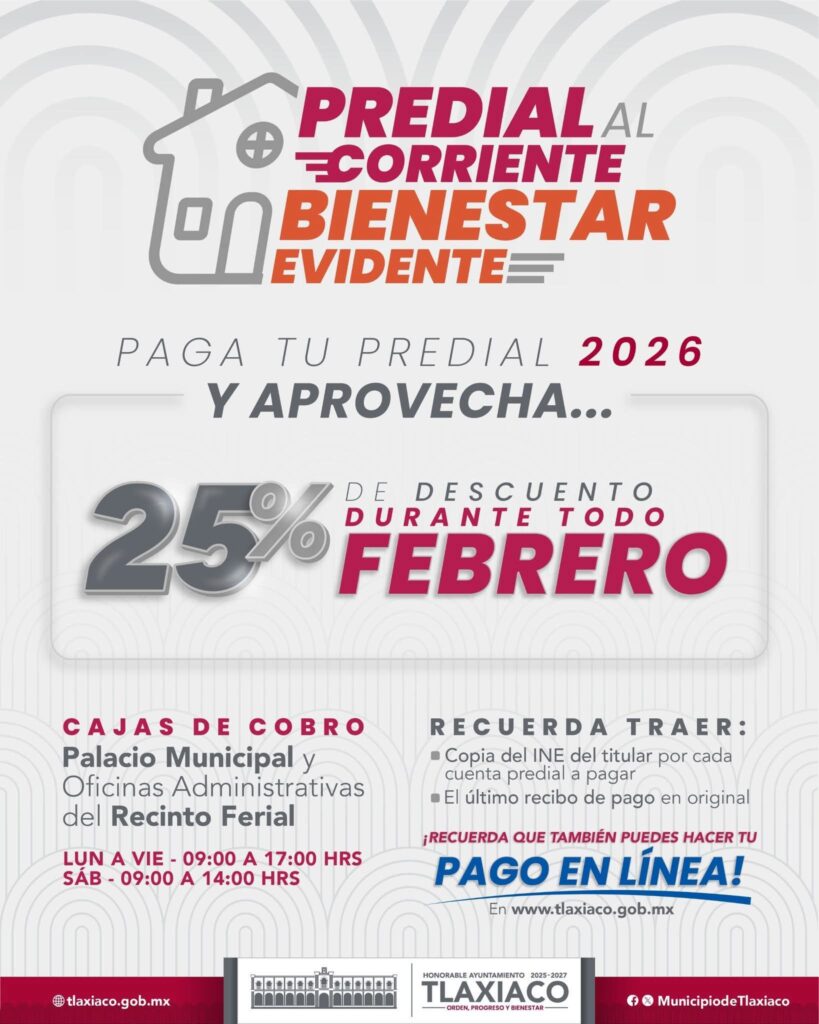 APROVECHA LOS ÚLTIMOS DÍAS PARA REALIZAR EL PAGO DEL PREDIAL 2026 DURANTE FEBRERO Y OBTÉN UN DESCUENTO