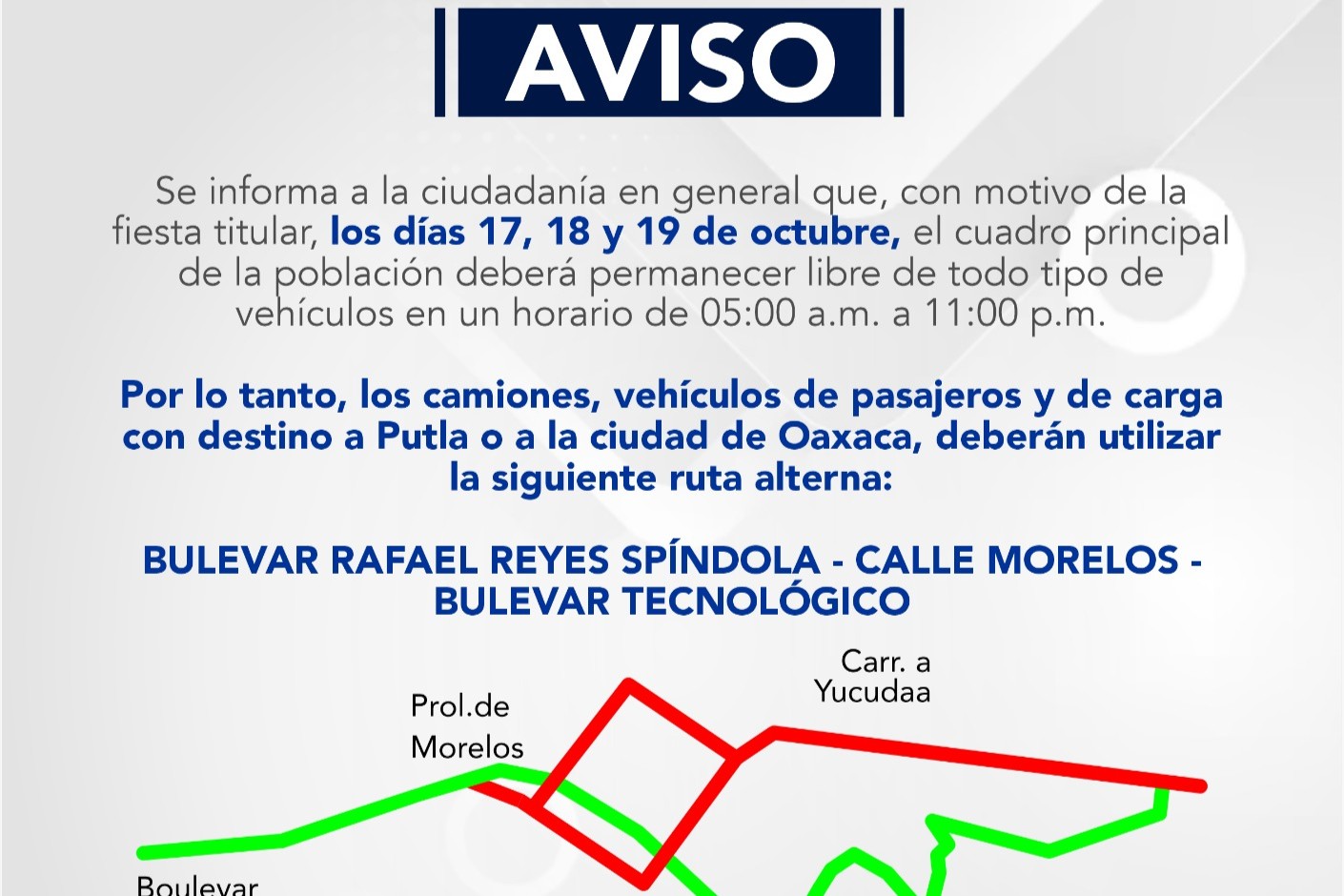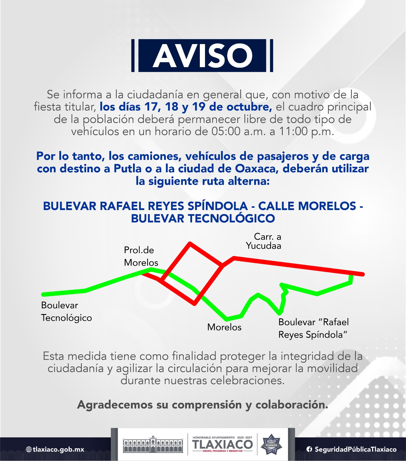 AVISO POR LA DIRECCION DE VIALIDAD MUNICIPAL AL 14 DE OCTUBRE DE 2025 Tlaxiaco, Oaxaca; a 15 de octubre de 2025 ¡Por una Ciudad Segura!