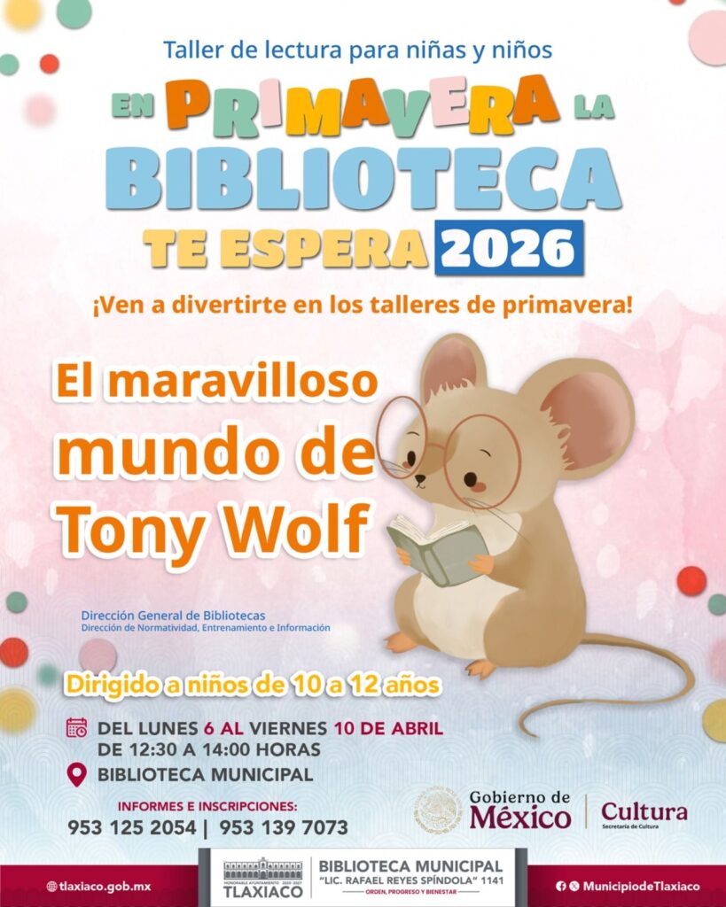La Biblioteca Pública Municipal «Rafael Reyes Spíndola 1141» invita a todas las niñas y niños de 10 a 12 años a participar en el Taller de Lectura «En primavera, la biblioteca te espera», que incluye la jornada semanal «El maravilloso mundo de Tony Wolf».