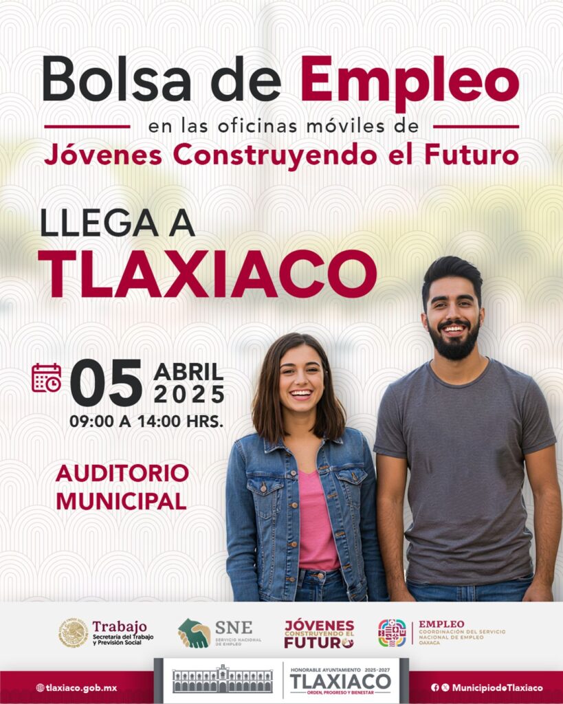 El H. Ayuntamiento de Tlaxiaco en conjunto con la Secretaría del Trabajo y Previsión Social y la Coordinación del Servicio Nacional de Empleo Oaxaca, invitan a los jóvenes interesados en participar en la Jornada de Bolsa de Empleo del “Programa de Jóvenes Construyendo el Futuro”, y recibir el servicio para ayudarte a encontrar un empleo.