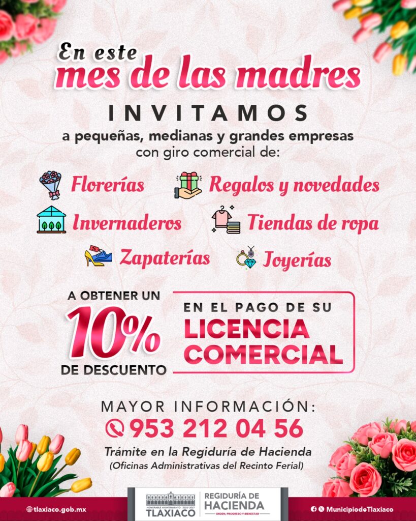 El H. Ayuntamiento a través de la Regiduría de Hacienda, durante todo el mes de mayo, los giros comerciales relacionados con el Día de las Madres podrán acceder a un 10% de descuento en el pago de su «licencia de funcionamiento comercial». Esta es una oportunidad especial para reconocer su labor y promover el desarrollo económico.