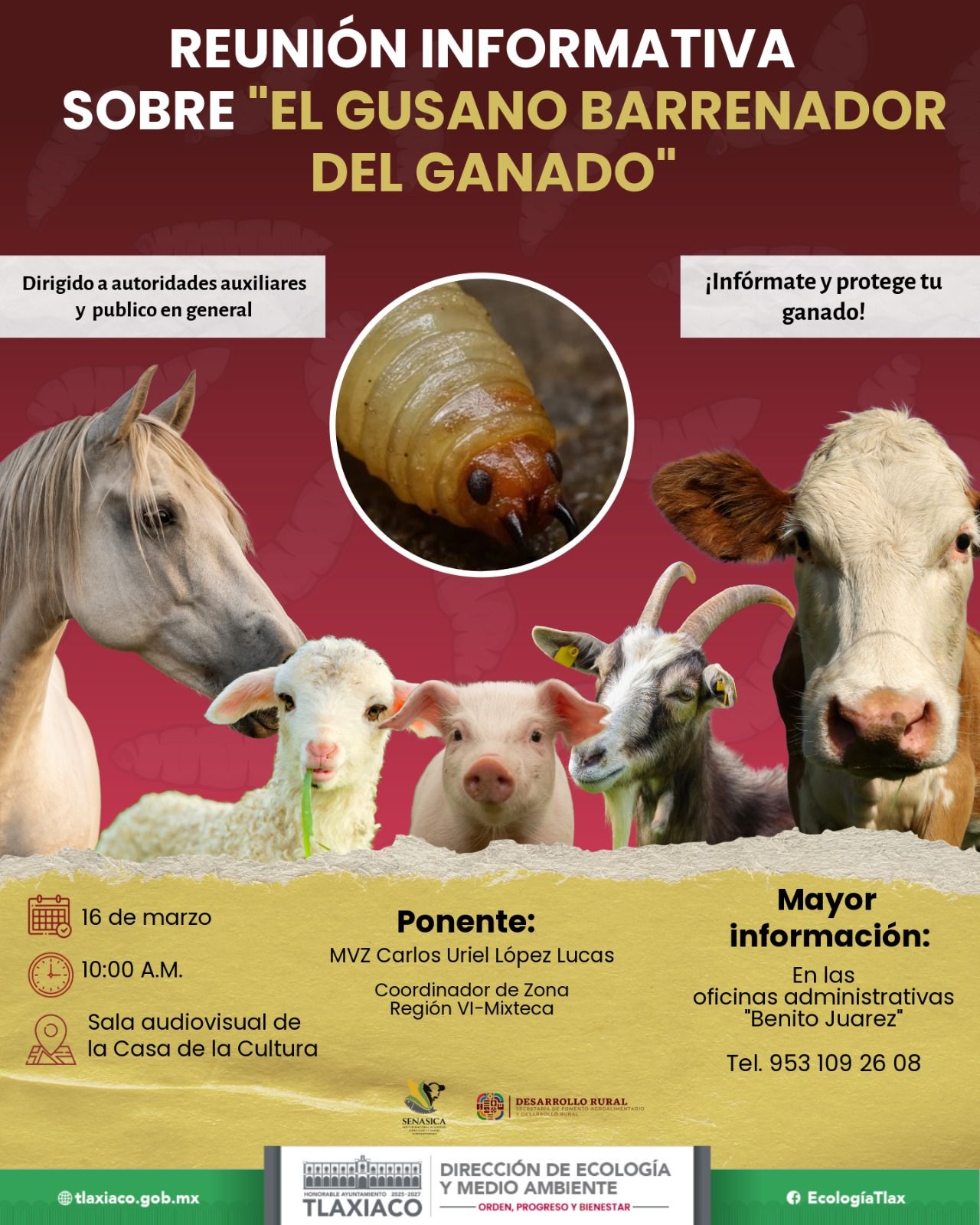 El Ayuntamiento, a través de la Dirección de Ecología, en coordinación con SENASICA y la Secretaría de Fomento Agroalimentario y Desarrollo Rural, invita cordialmente a Autoridades Auxiliares, productores y al público en general a participar en el segundo taller informativo sobre el Gusano Barrenador del Ganado.