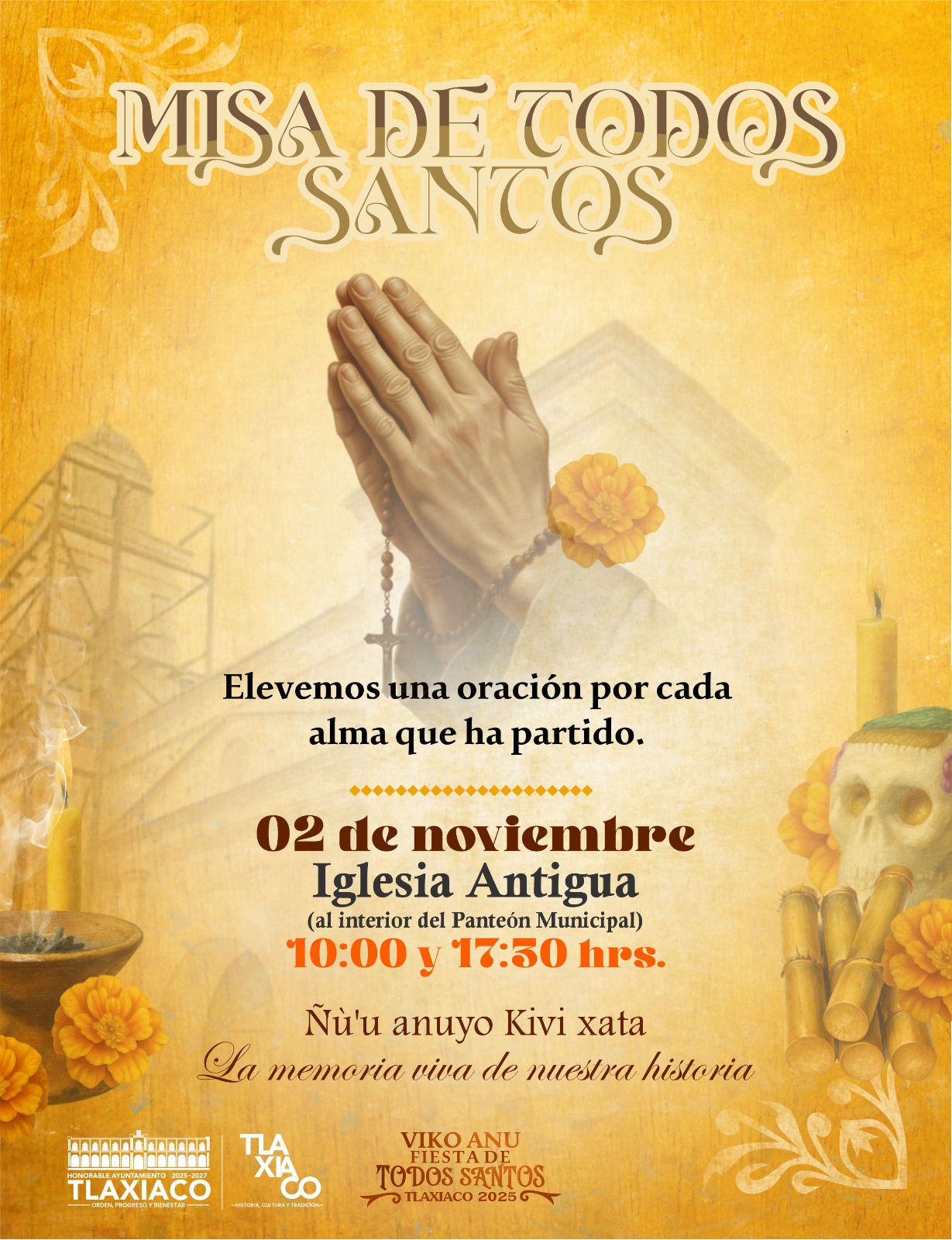 El H. Ayuntamiento de Tlaxiaco y la Parroquia de Santa María de la Asunción invitan a la ciudadanía a unirse en oración y recuerdo durante la Misa con motivo de Todos Santos, honrando con fe y esperanza a quienes viven para siempre en nuestra memoria.