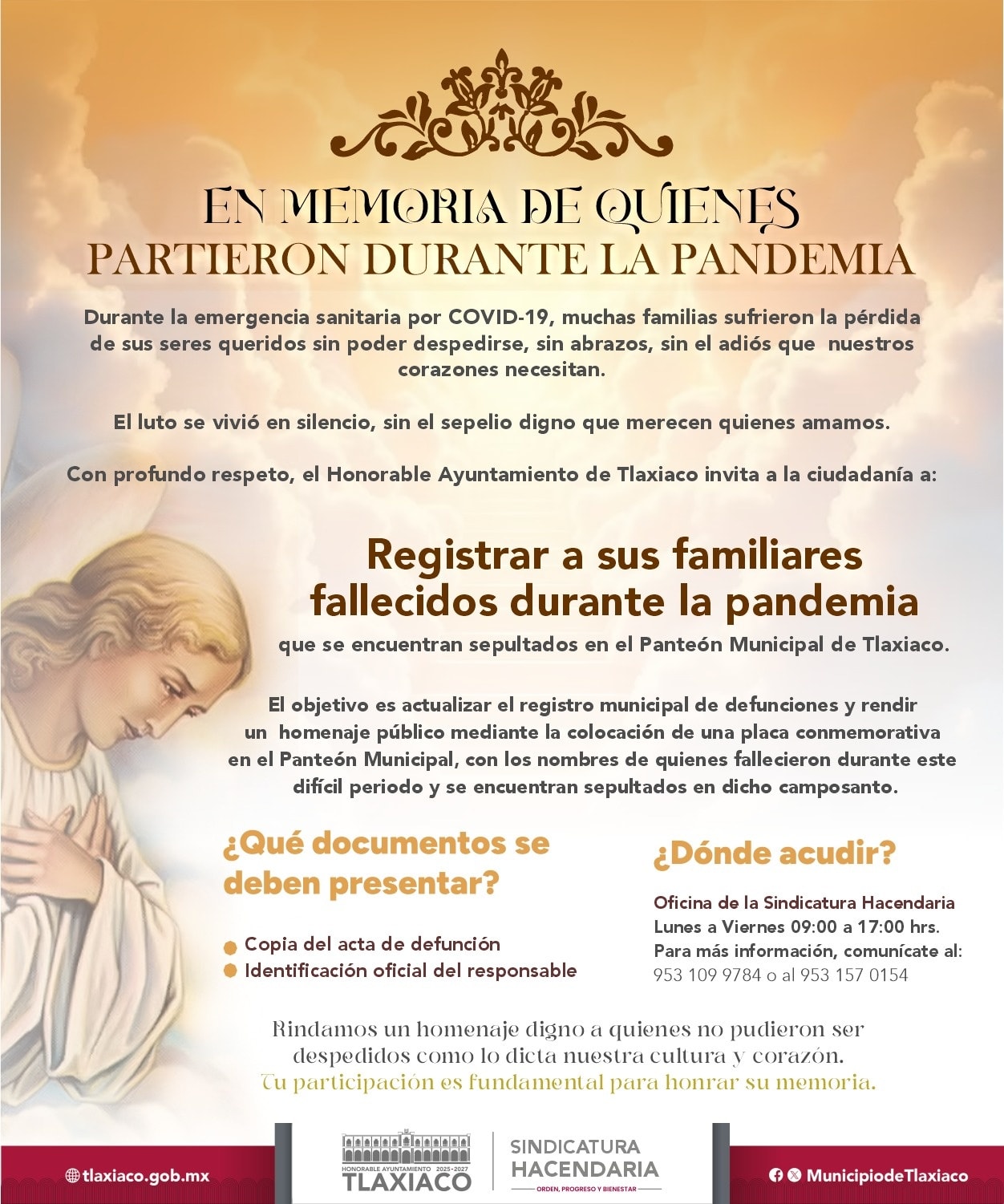 El Honorable Ayuntamiento de Tlaxiaco invita a las familias que perdieron a un ser querido durante la pandemia y que se encuentra sepultado en el Panteón Municipal, a registrarlo para rendirle un homenaje digno mediante una placa conmemorativa.