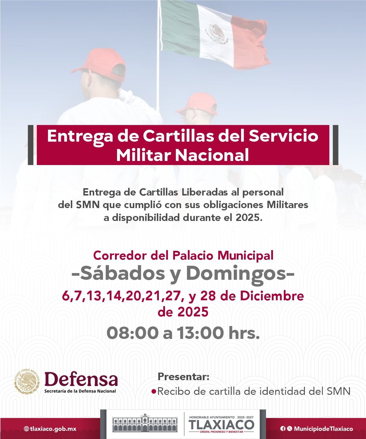 El H. Ayuntamiento en coordinación con la Secretaría de la Defensa Nacional hacen del conocimiento a la totalidad de los interesados se realizará la entrega de cartillas liberadas al personal del Servicio Militar Nacional que cumplió con sus obligaciones militares a disponibilidad durante el 2025.