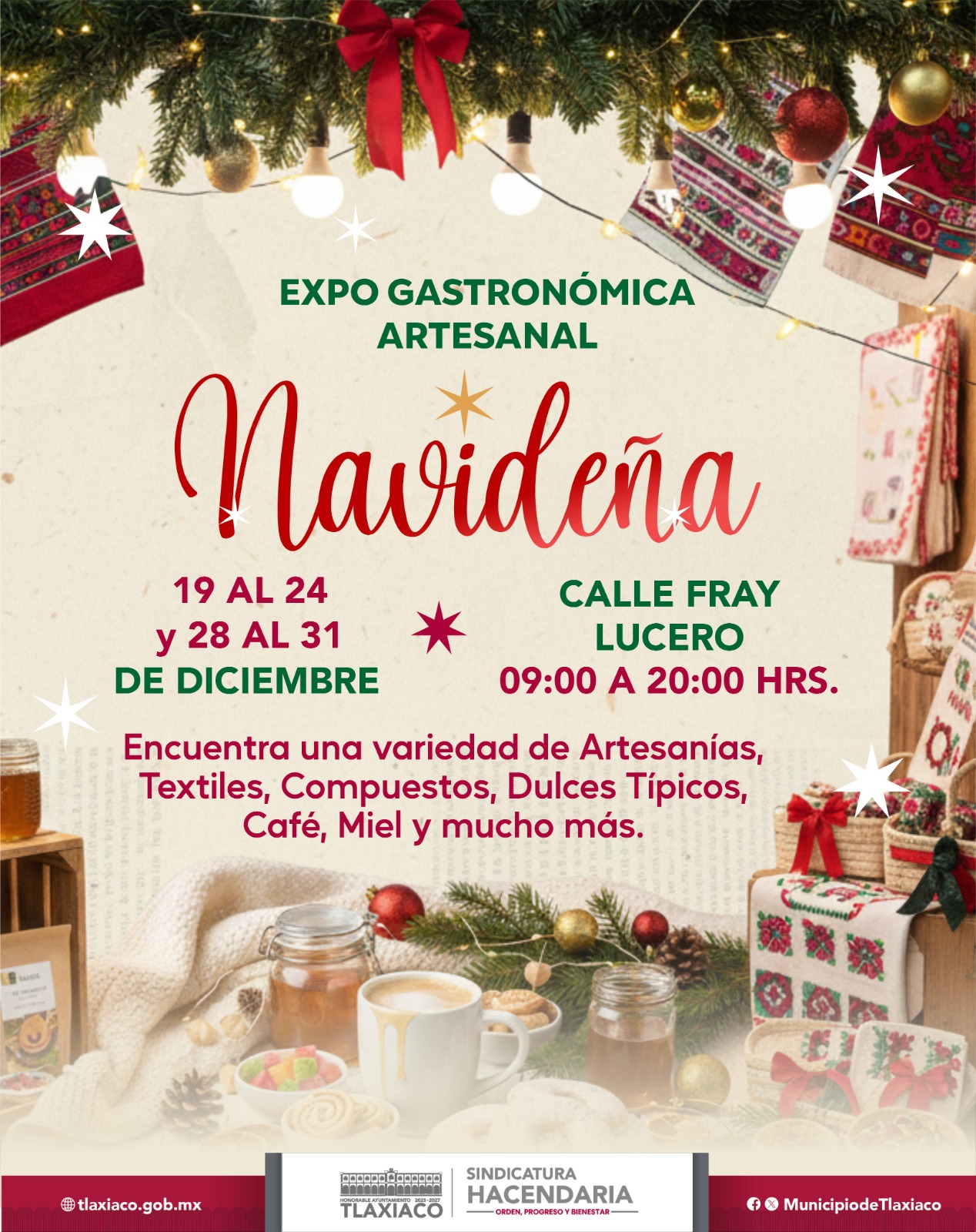 El H. Ayuntamiento de Tlaxiaco, a través de la Sindicatura Hacendaria, en coordinación con artesanos y expendedores de antojitos, invita a la población en general a la Expo-Gastronómica Artesanal Navideña, donde podrán disfrutar de momentos de convivencia familiar y conocer la riqueza de nuestros sabores tradicionales, artesanías, textiles, productos orgánicos y gastronomía típica.