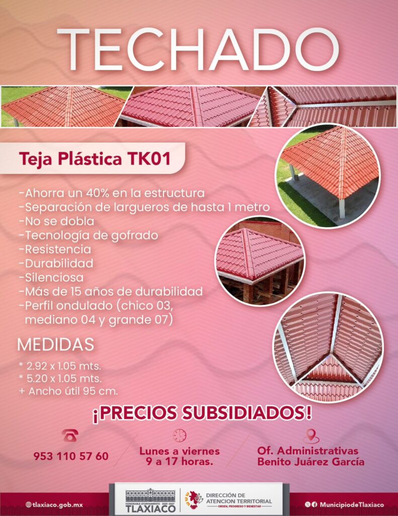 El H. Ayuntamiento a través de la Dirección de Atención Territorial informa a la ciudadanía que se encuentra disponible un programa especial de teja plástica a bajo costo, con el objetivo de apoyar la economía familiar.