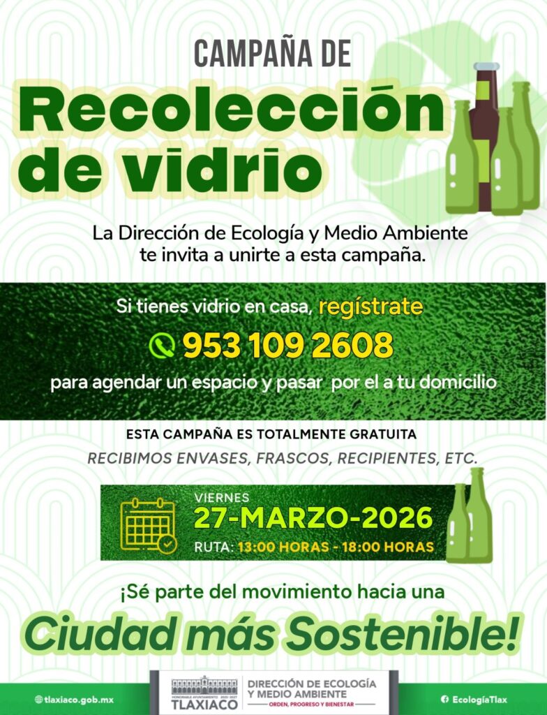 El H. Ayuntamiento, a través de la Dirección de Ecología y Medio Ambiente, invita a la ciudadanía que tenga vidrio en desuso a sumarse a la tercera campaña de recolección de vidrio, con el fin de garantizar su adecuado proceso de reciclaje.