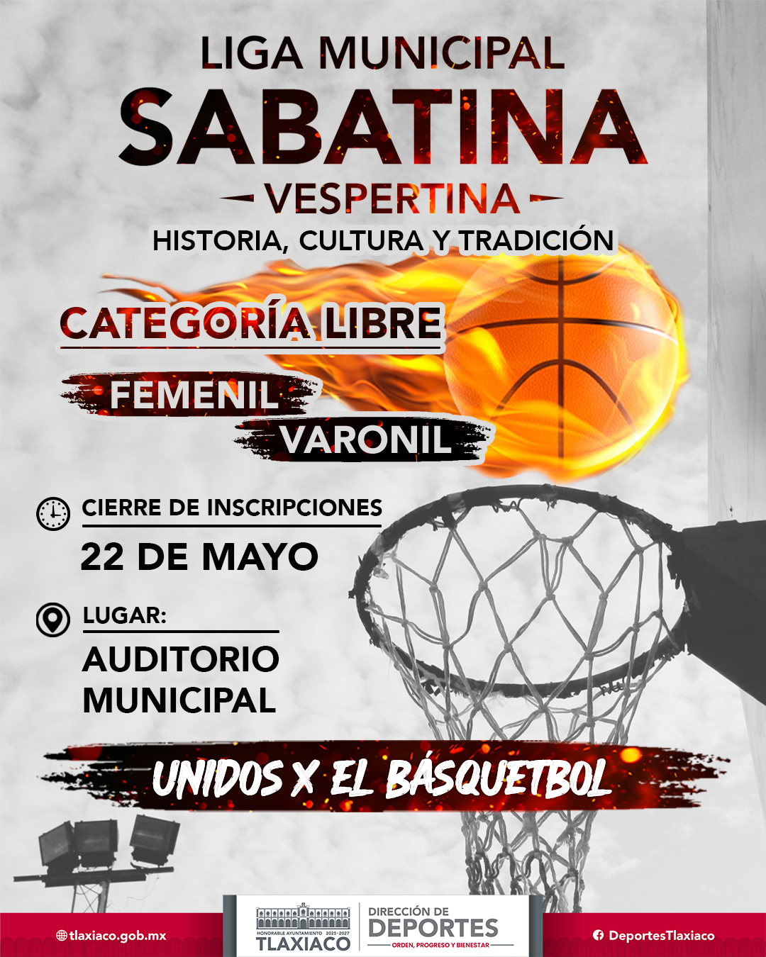 LIGA MUNICIPAL SABATINA Tlaxiaco, Oaxaca; a 16 de mayo de 2025 ¡Inscribe a tu equipo y participa! La convocatoria está abierta para la categoría libre en las ramas varonil y femenil. No pierdas la oportunidad de ser parte de esta liga de básquetbol.