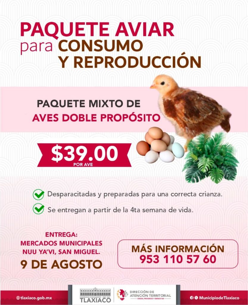 El H. Ayuntamiento, a través de la Dirección de Atención Territorial, invita a la ciudadanía interesada en adquirir pollitos de doble propósito —para consumo doméstico y como apoyo a la economía familiar— a participar en este programa de venta a precio subsidiado, como parte de las acciones en favor del bienestar y la autosuficiencia de los hogares.