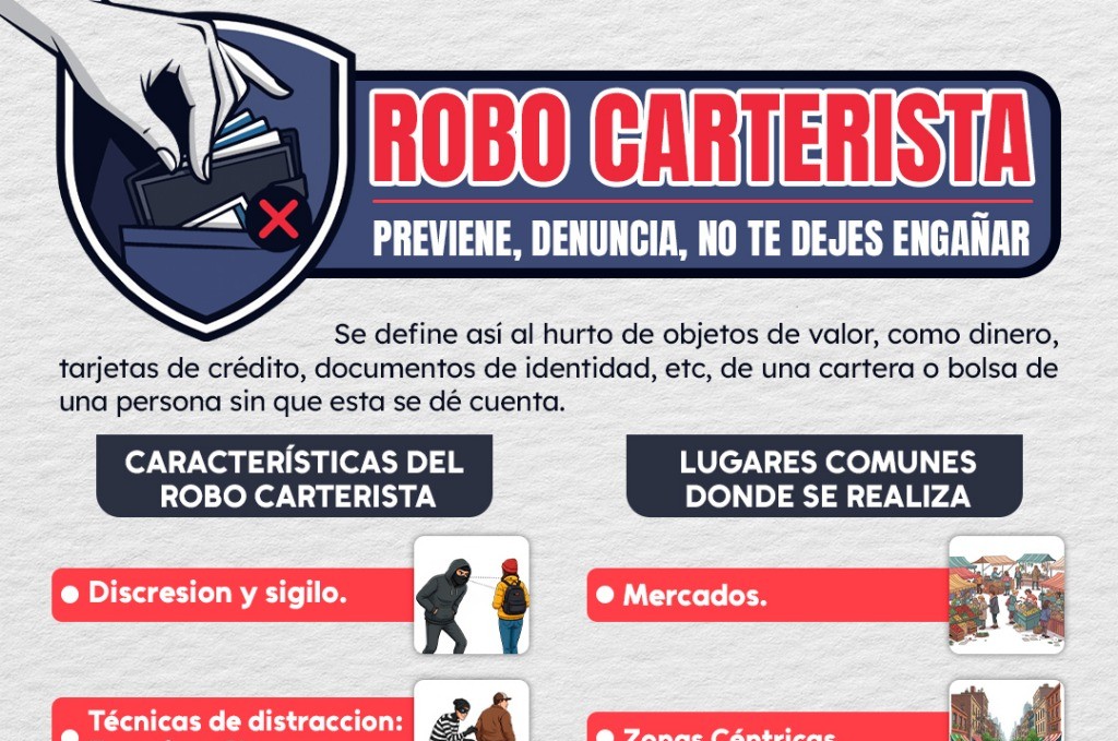 ROBO CARTERISTA: PREVIENE, DENUNCIA Y NO TE DEJES ENGAÑAR Tlaxiaco, Oaxaca; a 20 de septiembre de 2025 La Dirección de Seguridad Pública municipal exhorta a la población a estar alerta ante las distintas modalidades de estafa y robo carterista.Mantente atento en lugares concurridos.No pierdas de vista tus pertenencias.Reporta cualquier conducta sospechosa.¡Por una Ciudad Segura!