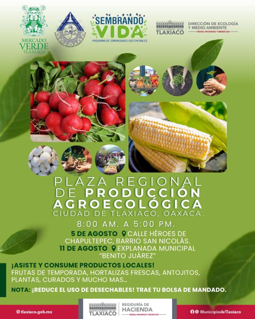 ¡TE INVITAMOS A LA PLAZA REGIONAL DE PRODUCCIÓN AGROECOLÓGICA! Tlaxiaco, Oaxaca; a 3 de agosto de 2025 Ven y disfruta de lo mejor de la región mixteca, comprando directo de productoras y productores locales:Frutas de temporada, Hortalizas frescas, Antojitos deliciosos, Plantas y curados artesanales… ¡y mucho más! 5 de agosto Calle Héroes de Chapultepec11 de agosto Explanada MunicipalApoya el comercio local y lleva a casa productos frescos, naturales y llenos de sabor! ¡Te esperamos con tu bolsa de mandado!
