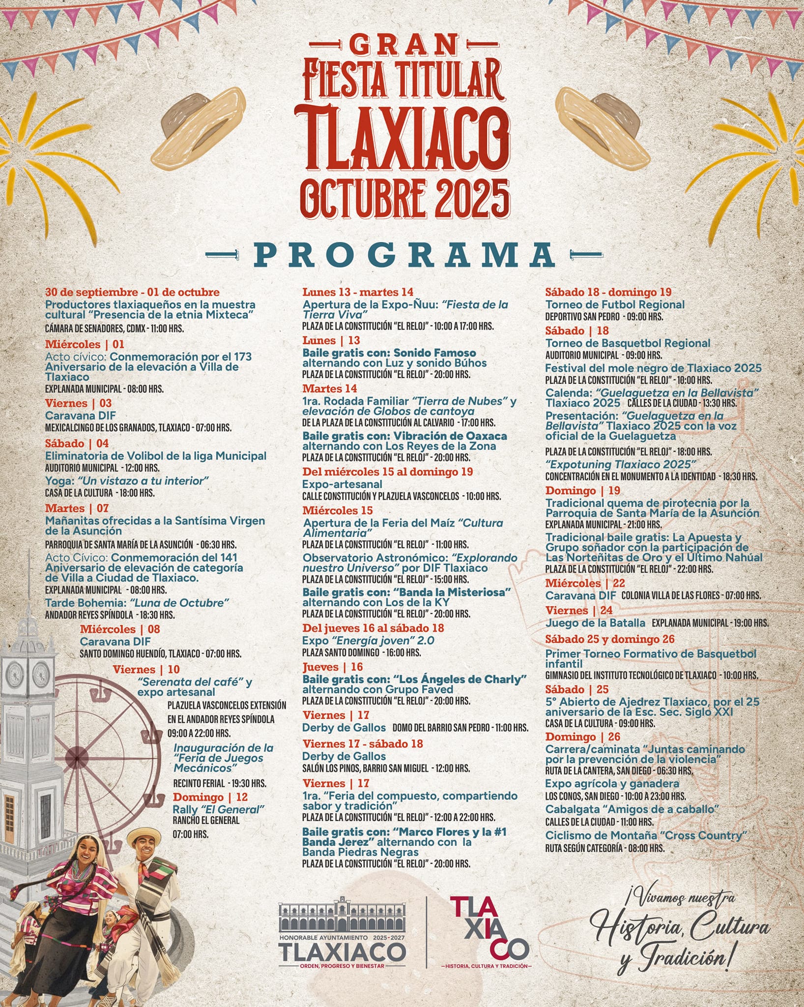 ¡Vɪᴠᴇ ɴᴜᴇsᴛʀᴀ Hɪsᴛᴏʀɪᴀ, Cᴜʟᴛᴜʀᴀ ʏ Tʀᴀᴅɪᴄɪᴏ́ɴ! Tlaxiaco, Oaxaca; a 30 de septiembre de 2025 Programación oficial de las actividades del H. Ayuntamiento de Tlaxiaco, en la Gran Fiesta Titular, Tlaxiaco 2025. Y presentación de la cartelera musical, del Teatro del Pueblo
